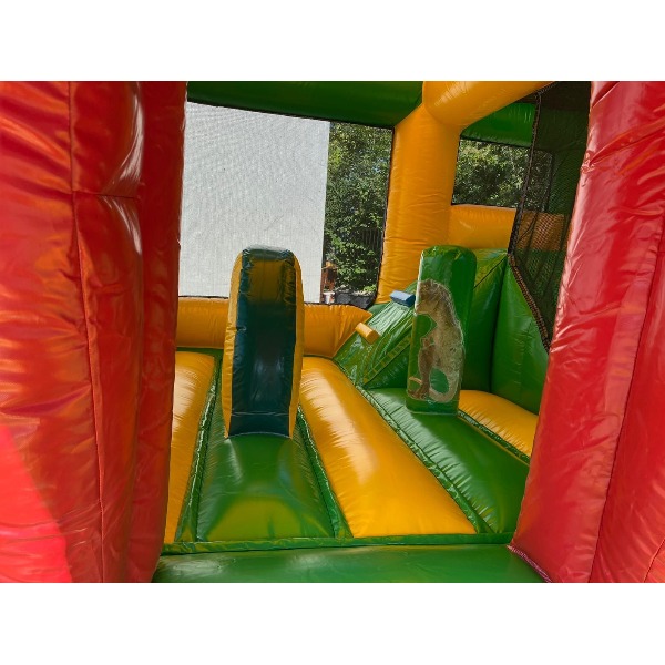 Het Multiplay Dino springkussen is een kleurrijk en stoer springkussen met glijbaan en een ruim springvlak. Kinderen beleven een spannend avontuur tussen de dinofiguren en kunnen zich uitleven met springen, klimmen en glijden. Het springkussen is overdekt, maar niet waterdicht.