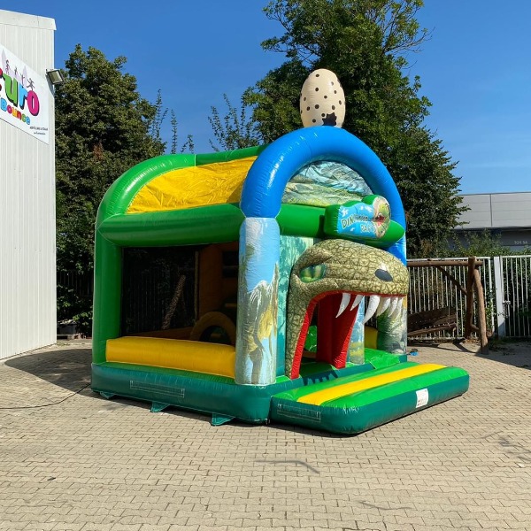 Het dino springkussen kan worden gehuurd via de website van Jumpertjes.
