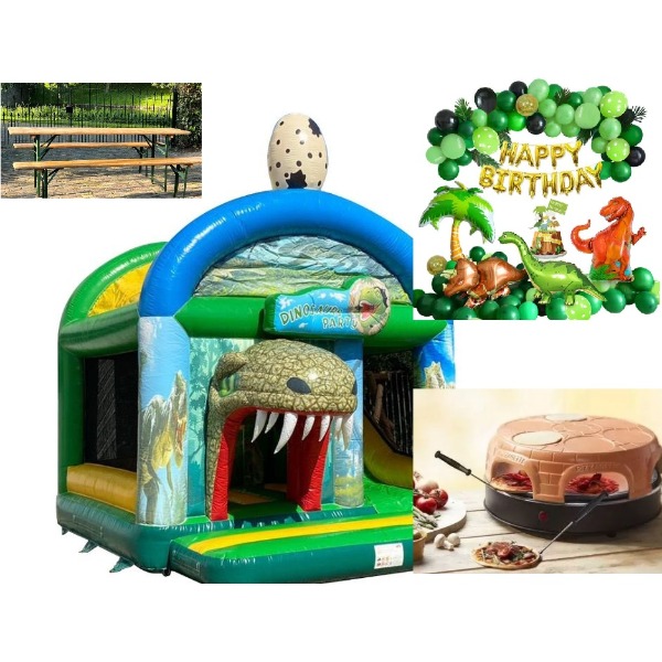 Ontdek onze exclusieve Dino Kinderfeestje Springkussen party deal en maak van elke gelegenheid een prehistorisch feest. Dit complete pakket bevat alles wat je nodig hebt voor een geslaagd Dino Kinderfeestje: het Dinosaurus springkussen, Dino decoratie, biertafel, bierbank en pizzarette!